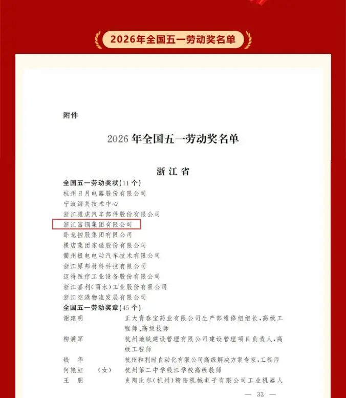 近日,2026年全国五一劳动奖评选结果揭晓,浙江富钢集团有限公司榜上有名,荣获“全国五一劳动奖状”!这是继2024年获得“全国模范职工之家”后,富钢再次摘得重量级国家荣誉。